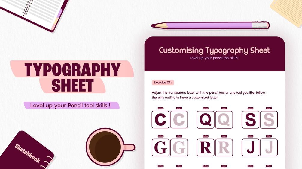 If you’re a designer struggling with customizing typography , this sheet will help you a lot , it has letters and words you can trace to improve your control with the pencil tool and sharpen your customization skills!